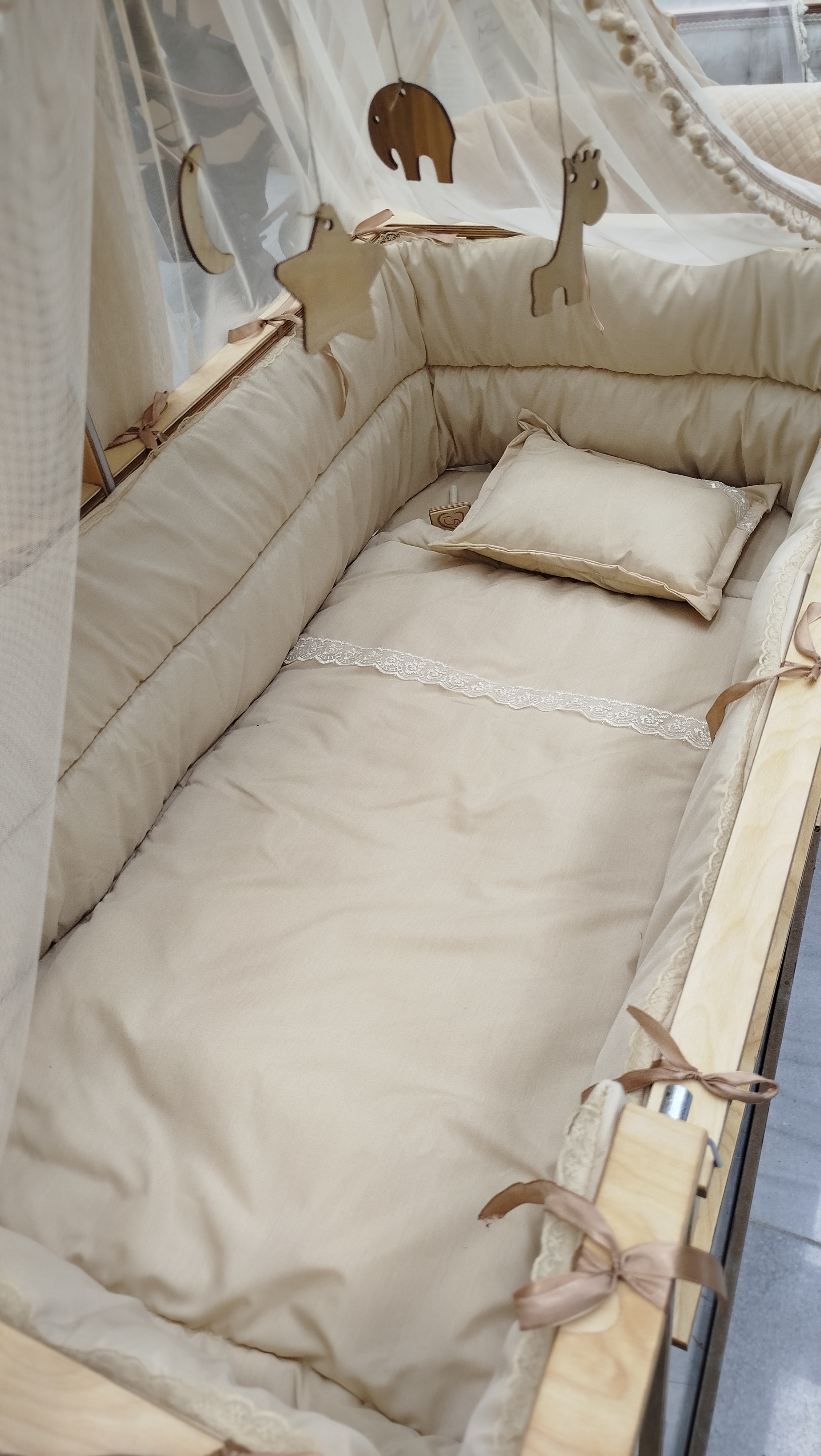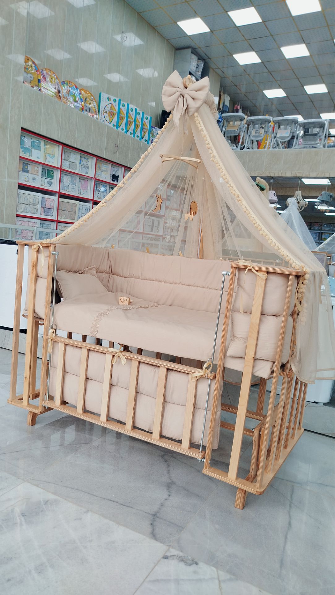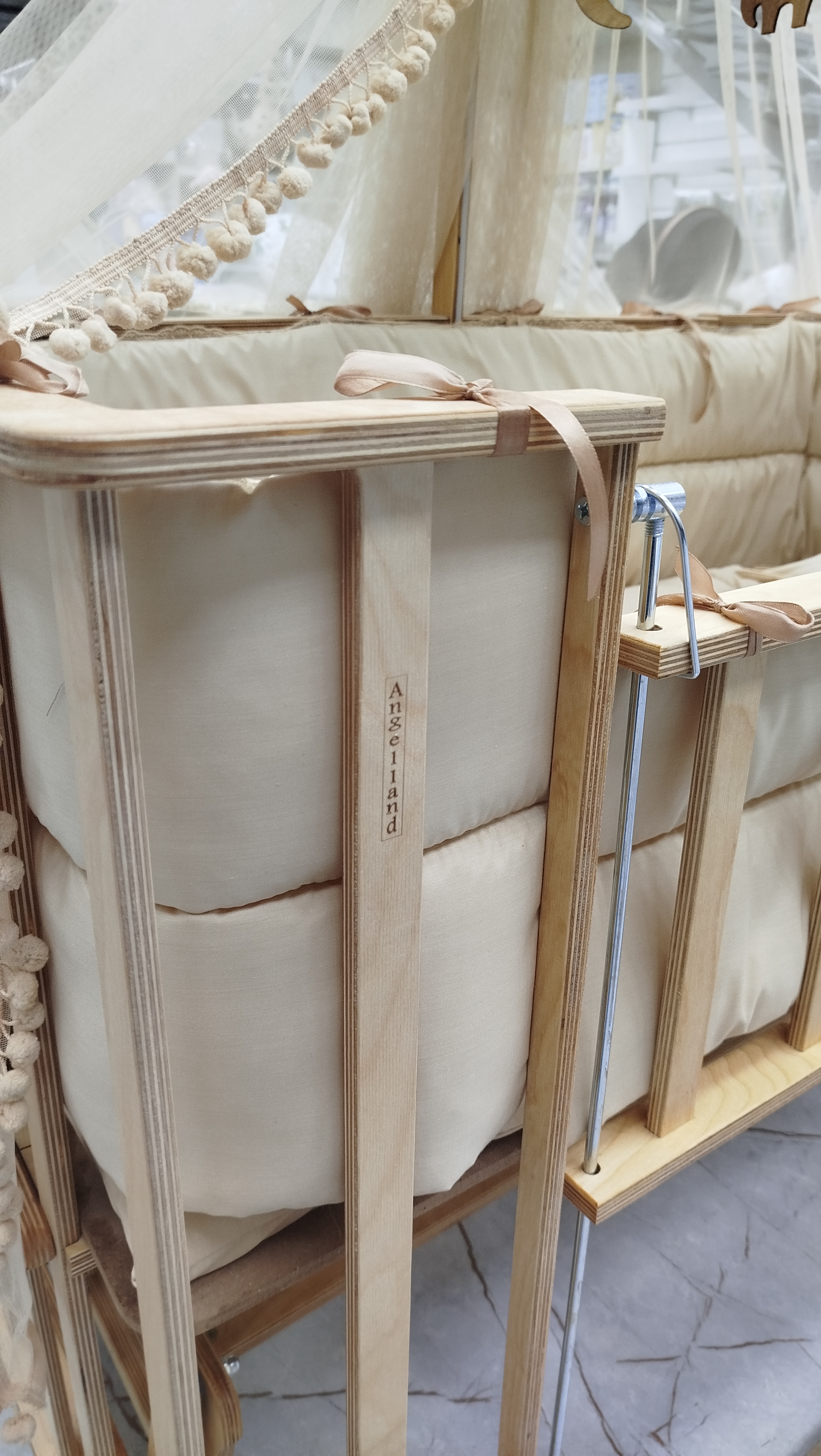 دارای تنظیم ارتفاع بغل باز شو دارد از گهواره کم میشود نور LED دارد آویز چوبی دارد دارای سرویس کامل (لحاف ، گارد ،تشک ،بالشت ) تخت کنار مادر برند آنجل لند مدل لنا در دو رنگ کرم و سفید عرضه میشود دارای ابعاد 70*125 و مناسب برای بدو تولد تا دوسال و نیم